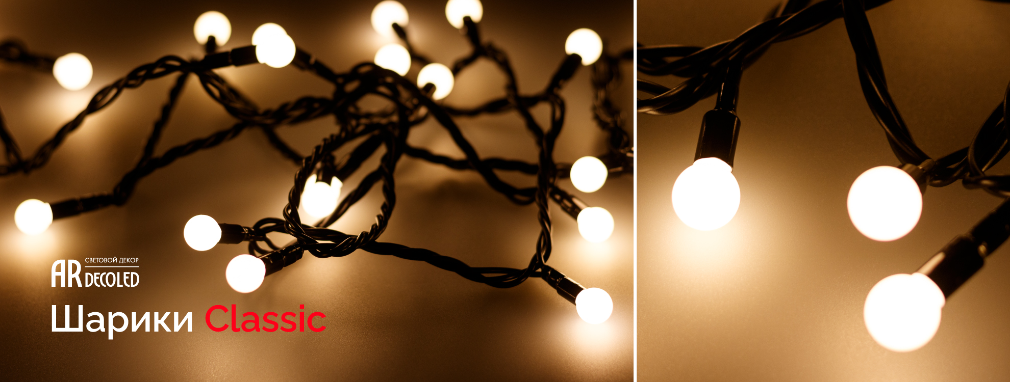 Гирлянда «Шарики» серии CLASSIC поможет создать праздничное настроение в помещениях и на улице под навесом. Гирлянды этого типа отлично подходят для оформления домашних интерьеров, а также украшения витрин и окон коммерческих пространств и создания растяжки между фонарями и деревьями.