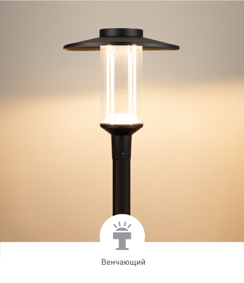 Алюминиевый корпус в черном цвете, стеклянный плафон, напоминающий аутентичные парковые светильники.