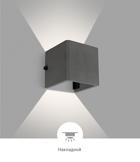 Настенный светильник создает лучи света, направленные вверх и вниз, с теплым цветом свечения (3000 K) и высокой цветопередачей (СRI>90), подчеркивая рельеф поверхности архитектурных сооружений. Кубический корпус выполнен из бетона и гармонично смотрится на фасадах зданий. Угол каждого из лучей регулируется, чтобы формировать выразительные световые акценты на поверхностях стен. Высокая степень защиты IP65 предотвращает попадание влаги и пыли внутрь светильника, что позволяет использовать его под открытым небом.