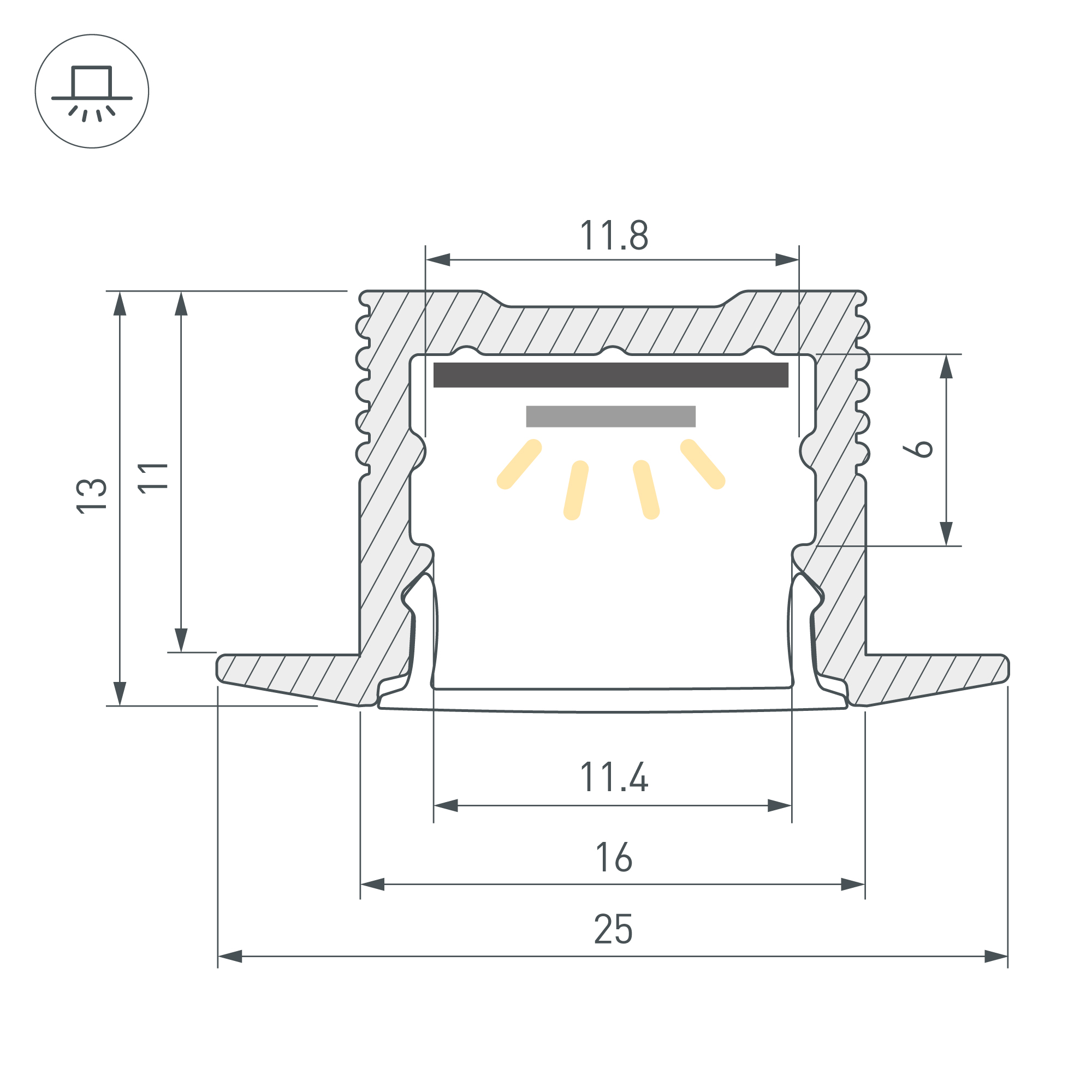 Встраиваемый профиль с накладным фланцем из анодированного алюминия для контурной подсветки интерьера. Габаритные размеры профиля составляют 2000 мм в длину, 25 мм в ширину и 13 мм в высоту. Площадка для установки светодиодных лент позволяет использовать ленту шириной до 12 мм и мощностью до 15,2 Вт/м. Это обеспечивает гибкость в выборе светодиодных лент и создает потрясающие световые решения. Экран, заглушки и другие аксессуары не включены в комплект и приобретаются отдельно. Цена указана за 1 метр профиля. Отличное решение для создания современных световых проектов.