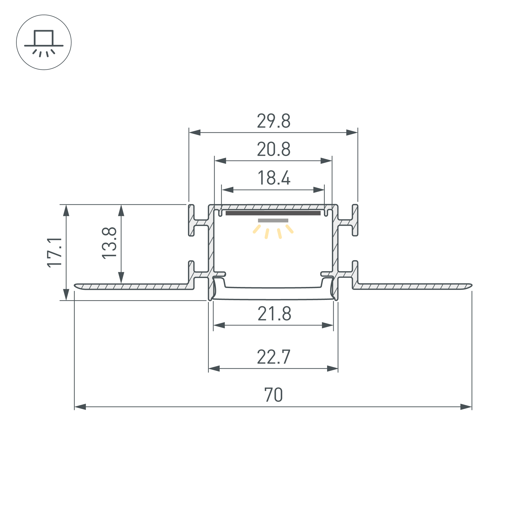 Алюминиевый встраиваемый гибкий профиль для светодиодных лент и линеек. Изгиб вверх/вниз. Минимальный радиус изгиба 30 см. Габаритные размеры (L×W×H): 2000х70х17,1 мм. Ширина площадки для ленты 17 мм. Экраны, заглушки и другие аксессуары приобретаются отдельно. Цена за 1 метр.