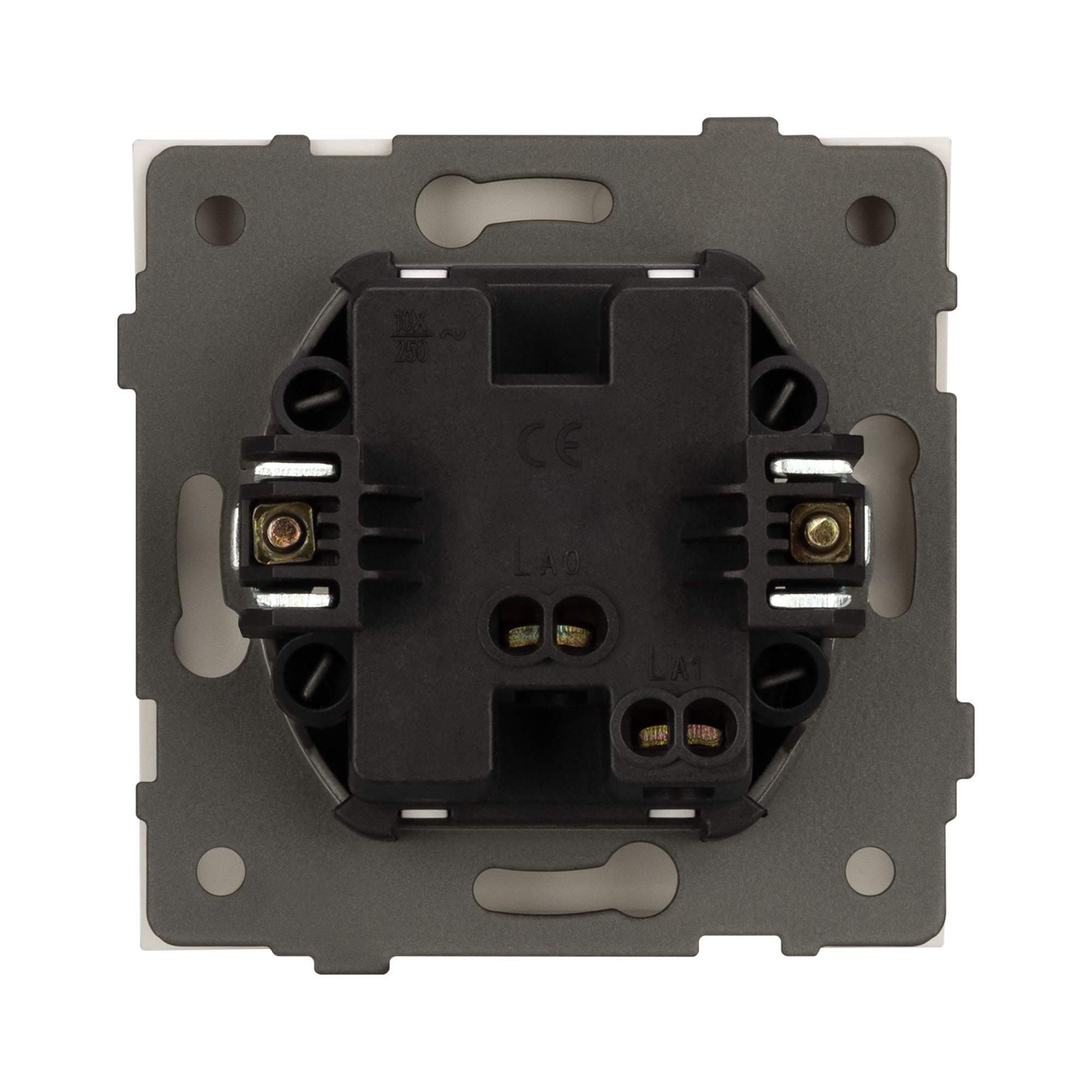 Контактная часть присоединяется при помощи винтовых зажимов, позволяя надежно подсоединить механизм выключателя к питающим элементам. А усиленные распорные лапки двойного захвата надежно фиксируют механизм в установочном подрозетнике круглого сечения диаметром 60мм.
