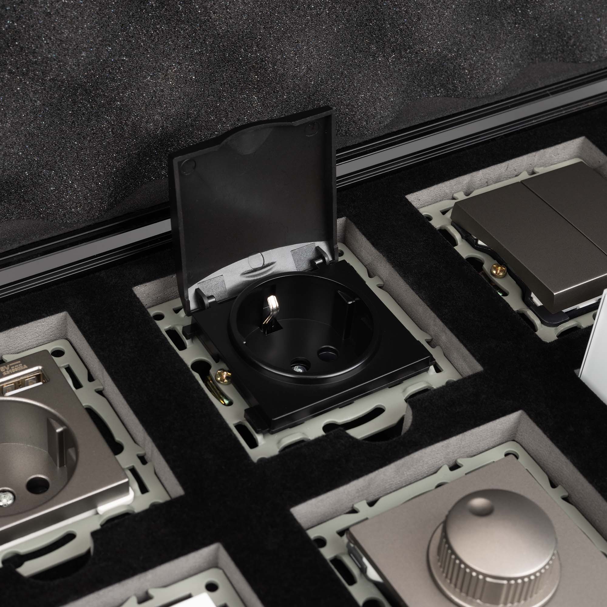 Демо-кейс с наполнением электроустановочных изделий серий VERSA, GLARE, PRESTO и сопутствующих механизмов.