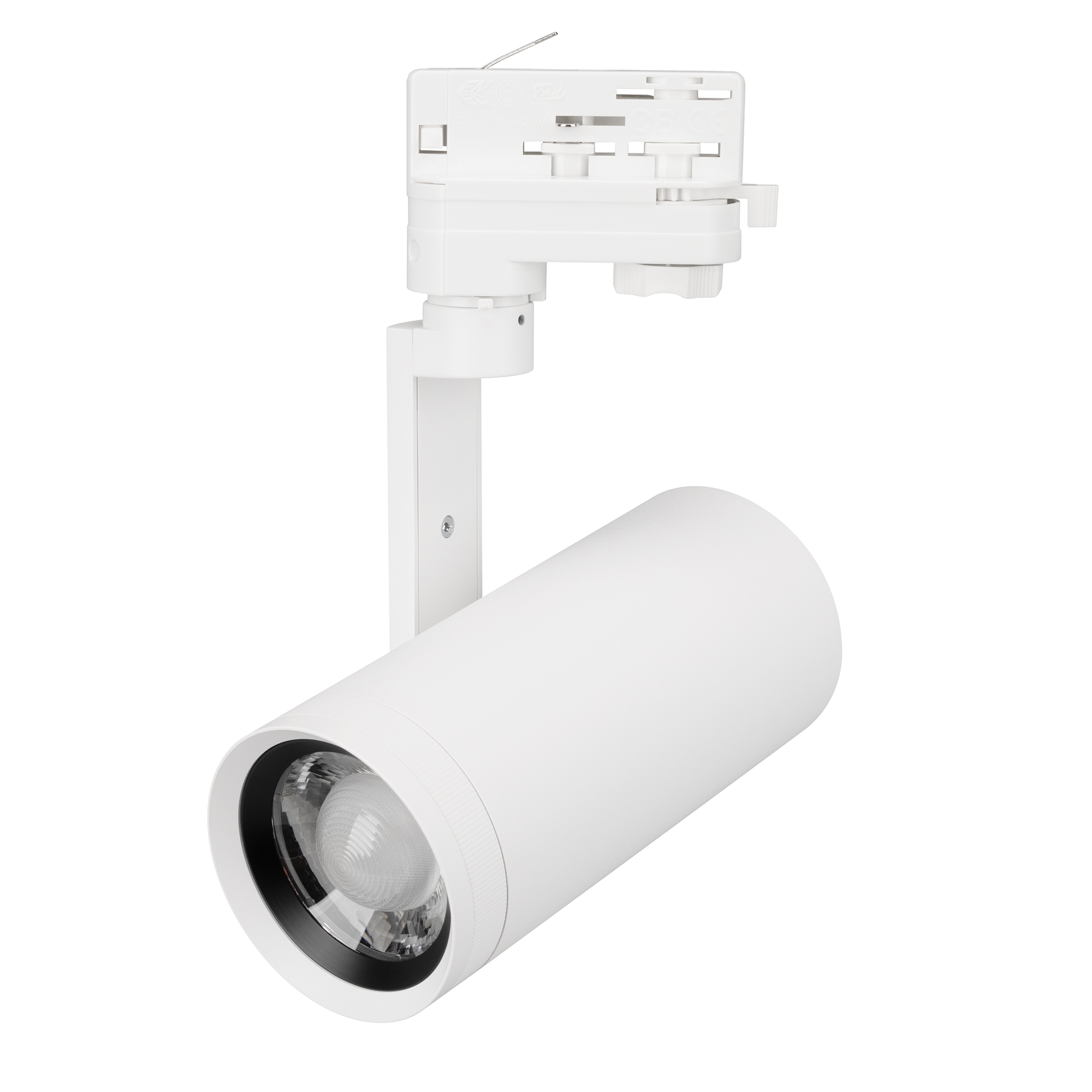 Светильник для треков/шин 4 провода, 18Вт/25Вт. Цвет свечения меняется в диапазоне 2700K/3000K/3500K/4000K/5700K (при помощи переключателя на корпусе), световой поток 1140-2075лм, регулируемый угол 20°-50°, CRI>90. Корпус круглый, металл, цвет черный, IP20. Угол наклона корпуса 90°, угол поворота корпуса 330°. Габариты LxWxH: 90х75x255мм. Размер модуля DxL: 75x165мм. Входное напряжение AC220-240V, мощность 25Вт.