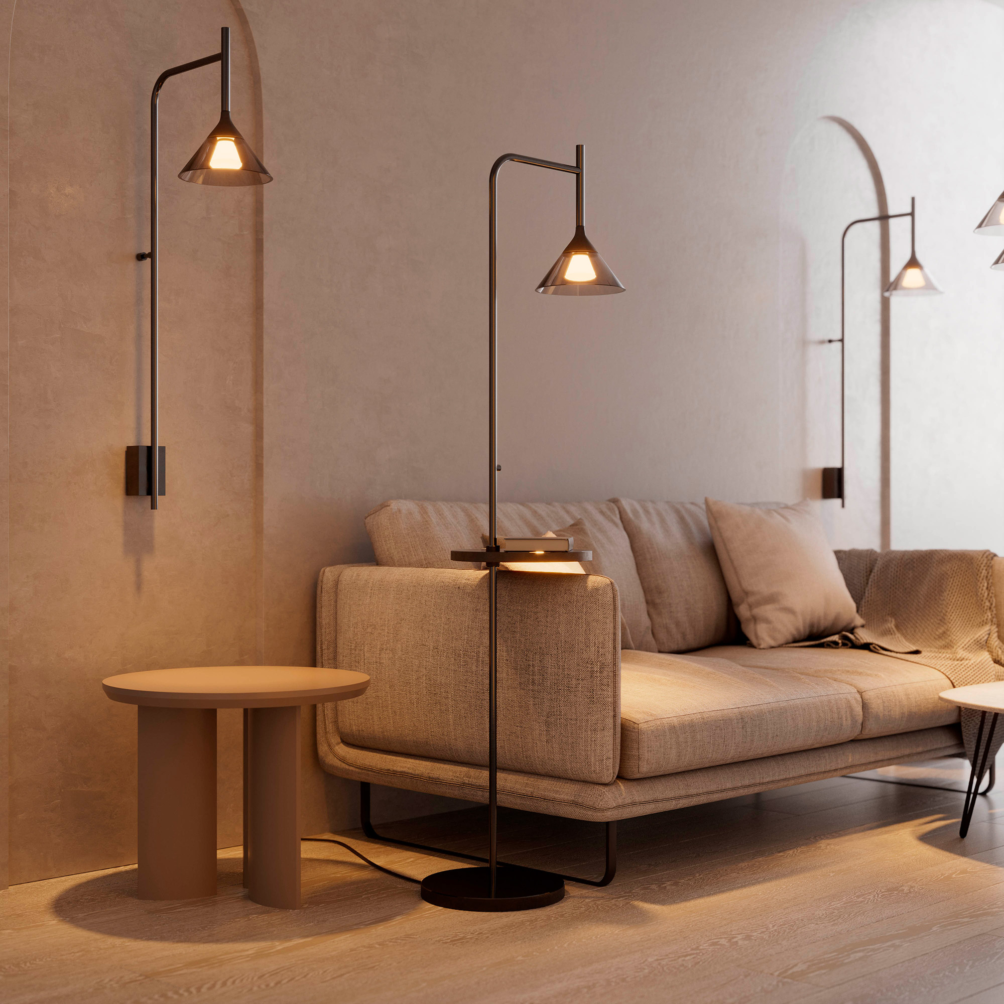 Напольный светильник. Мощность 7 Вт, св. поток 355 лм, 50 лм/Вт, теплый 3000К, CRI>94, угол 30°, напряжение питания 230 В. Черный корпус из алюминия с конусообразным стеклянным плафоном дымчатого цвета, степень защиты IP20. Размеры: диаметр плафона 200 мм, высота плафона 180 мм, диаметр напольной базы 300 мм, общая высота светильника 1590 мм. Сенсорная кнопка на ножке: короткое нажатие - on/off, длинное нажатие - регулировка яркости. Монтаж напольный, также возможна регулировка столика. Драйвер 24 В, 750 мА, пульсация <1%.