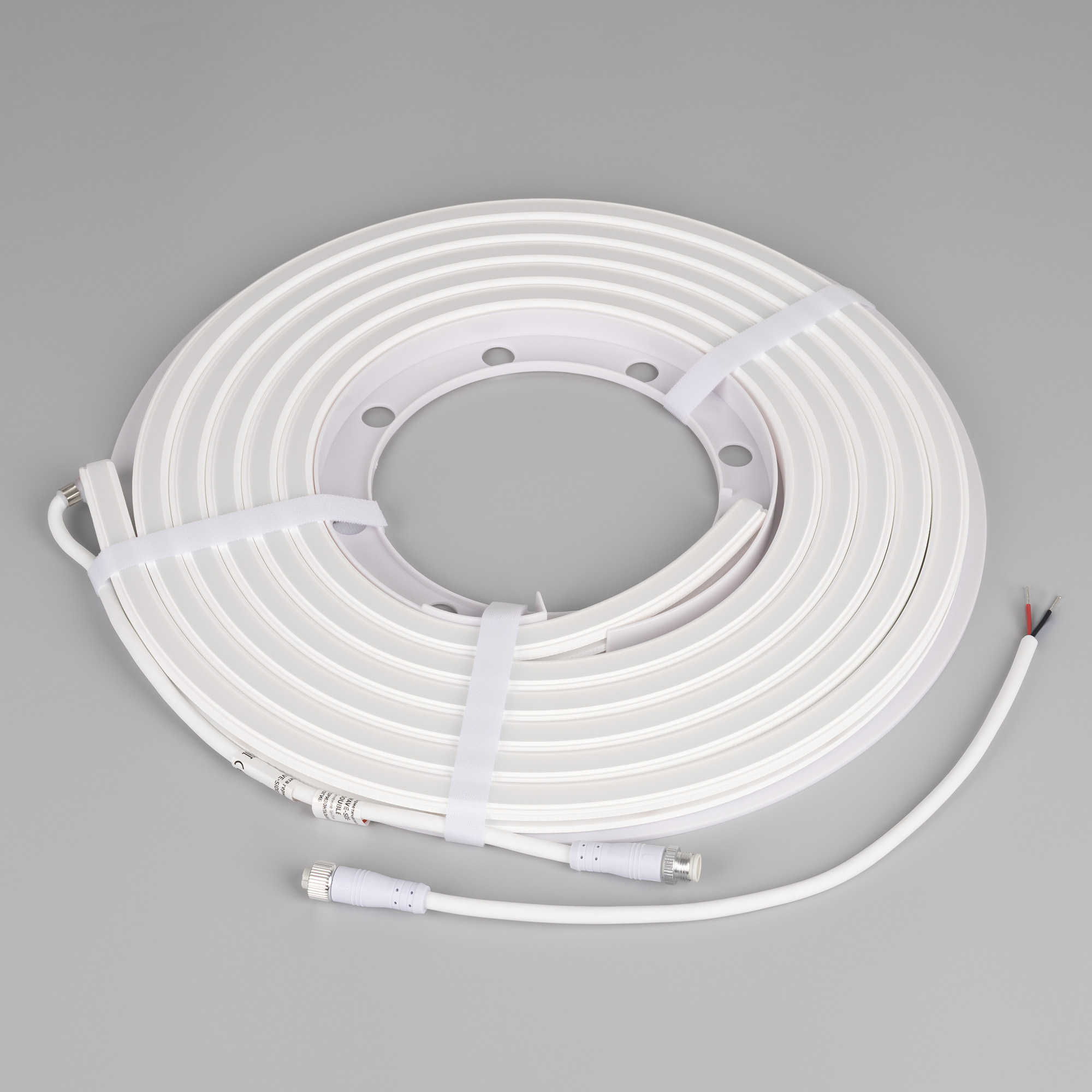 Гибкая герметичная лента (неон серии WAVE), сечение 16×15 мм. Светодиоды SMD2835 120 шт/м. Цвет свечения ТЕПЛЫЙ БЕЛЫЙ (3000 К), индекс цветопередачи CRI>90, световой поток 617 лм/м, угол излучения 292°. Мощность 15 Вт/м, питание 24 В. Класс пылевлагозащиты IP67. Размеры 5000×16×15 мм. Мин. отрезок 50 мм. Горизонтальный изгиб SIDE, свечение в две стороны, минимальный радиус изгиба 100 мм. Вывод кабеля с одной стороны перпендикулярно линии сечения неона. Катушка 5 м. Цена за 1 м. Гарантия 5 лет.