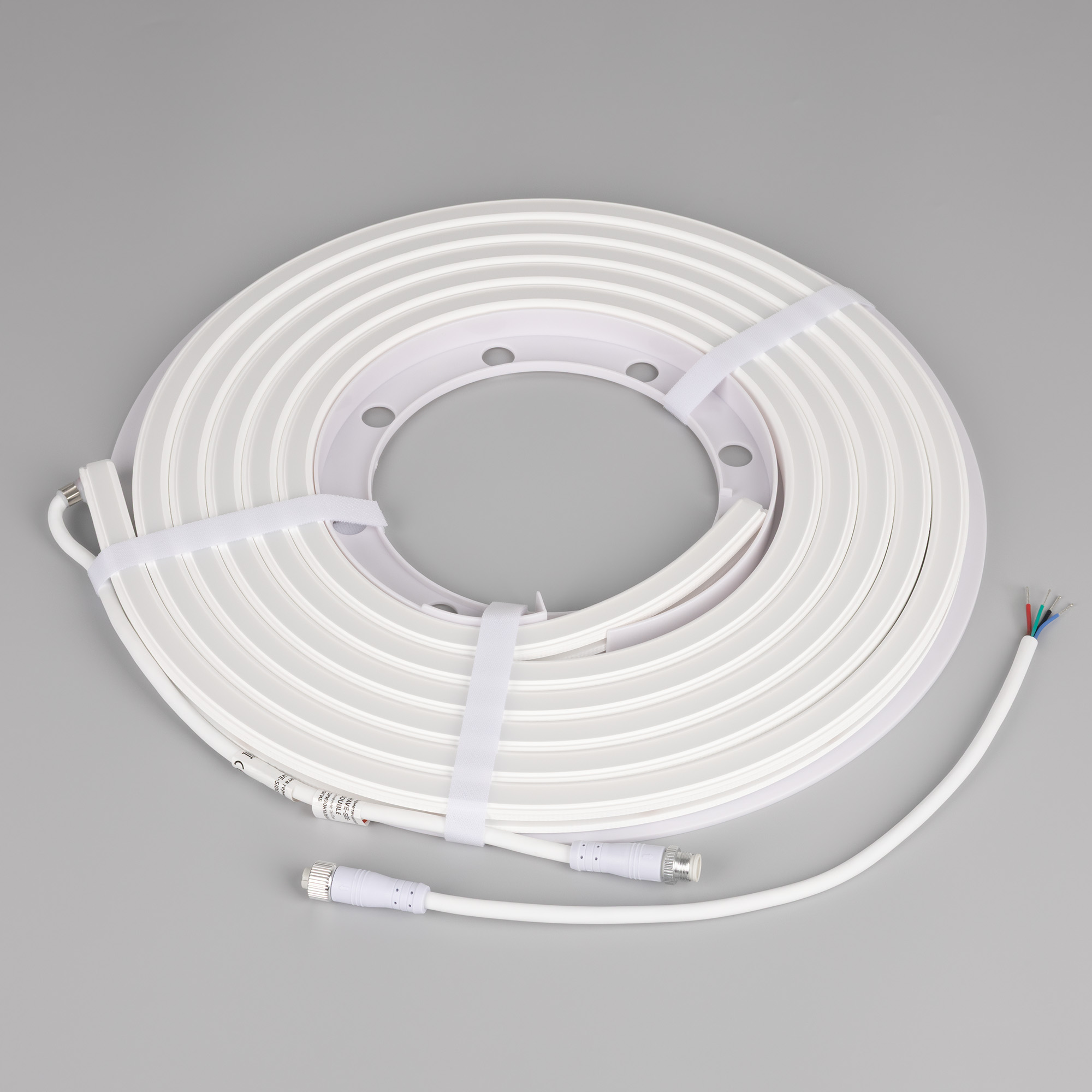 Гибкая герметичная лента (неон серии WAVE), сечение 16×15 мм. Светодиоды SMD5060 84 шт/м. Цвет свечения RGB, угол излучения 292°. Мощность 10 Вт/м, питание 24 В. Класс пылевлагозащиты IP67. Размеры 5000×16×15 мм. Мин. отрезок 83.3 мм. Горизонтальный изгиб SIDE, свечение в две стороны, минимальный радиус изгиба 100 мм. Вывод кабеля с одной стороны перпендикулярно линии сечения неона. Катушка 5 м. Цена за 1 м. Гарантия 5 лет.
