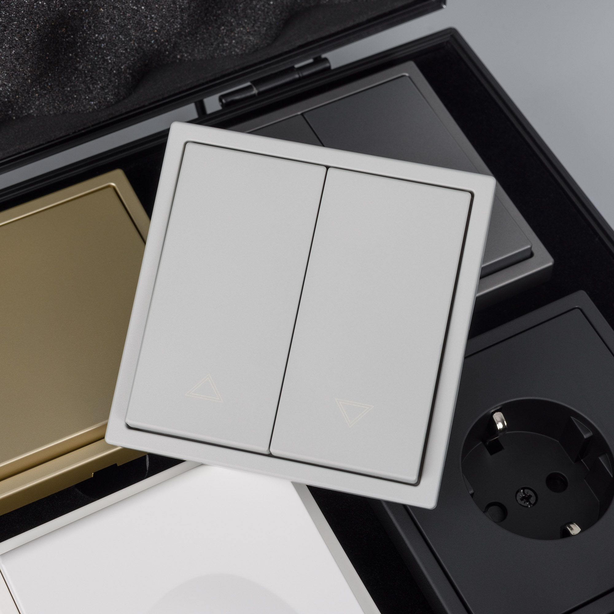 Рамки серии NOBE в цветах Белый кварц, Черный оникс, Золотой песок и Серый базальт. Поверхность рамок имеет Soft-Touch покрытие: