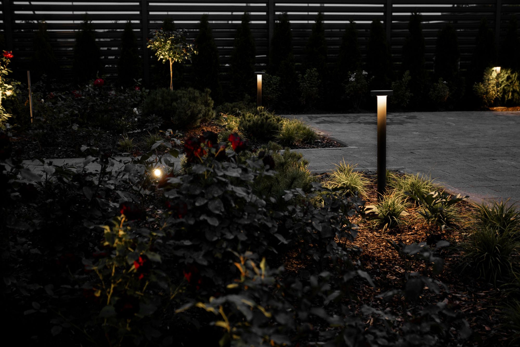 Акцентный слой, выполненный светильниками серии RAY, подчеркивает красоту кустарников и розария.