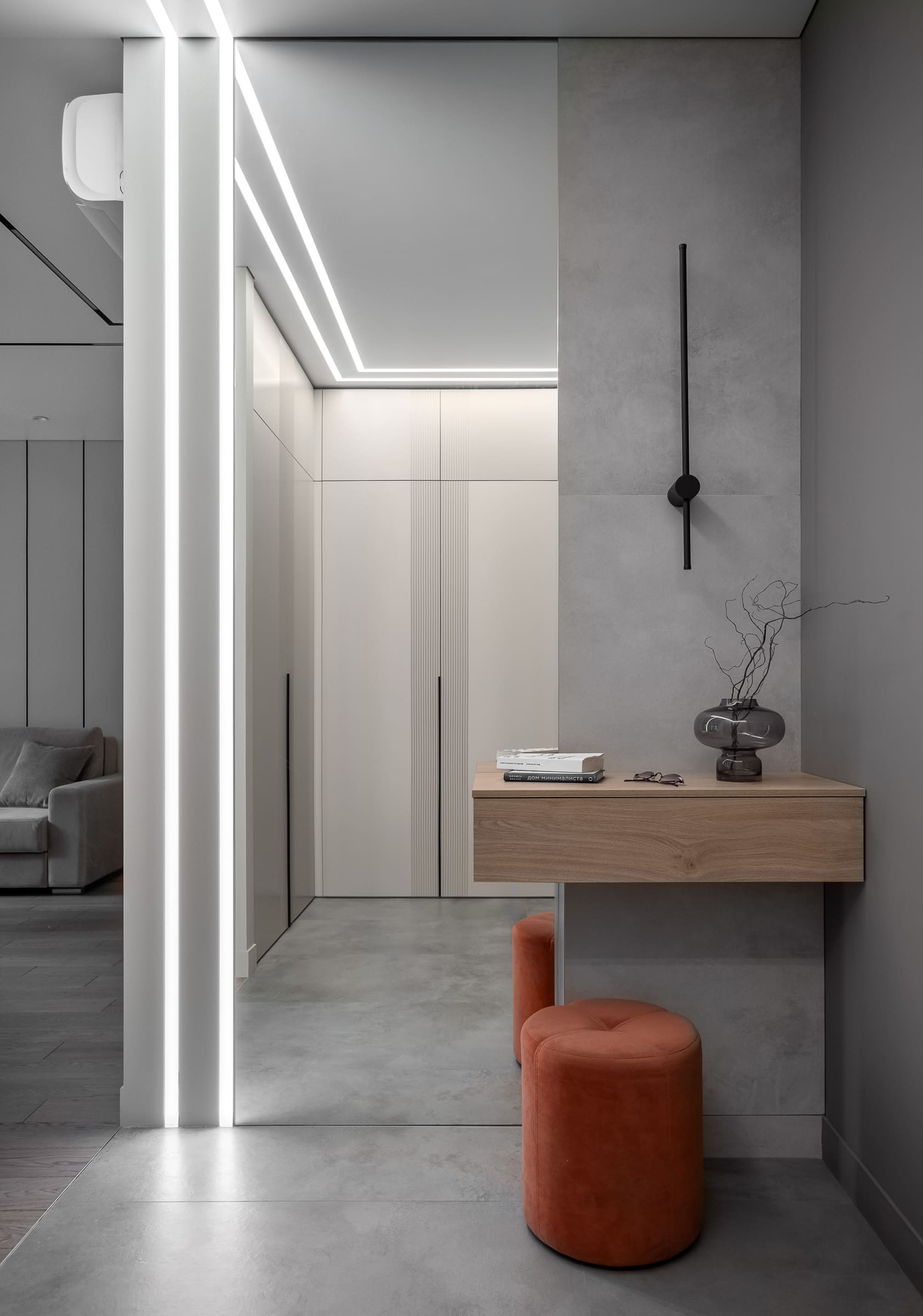 Парные линии света в прихожей сходят с потолка на стены, что создает достаточную освещенность в самой темной зоне квартиры. Для данной цели были применены светодиодные ленты серии RT с двумя рядами светодиодов. Главная особенность этих лент — очень высокий индекс цветопередачи (CRI>98), благодаря чему создается эффект естественного света.