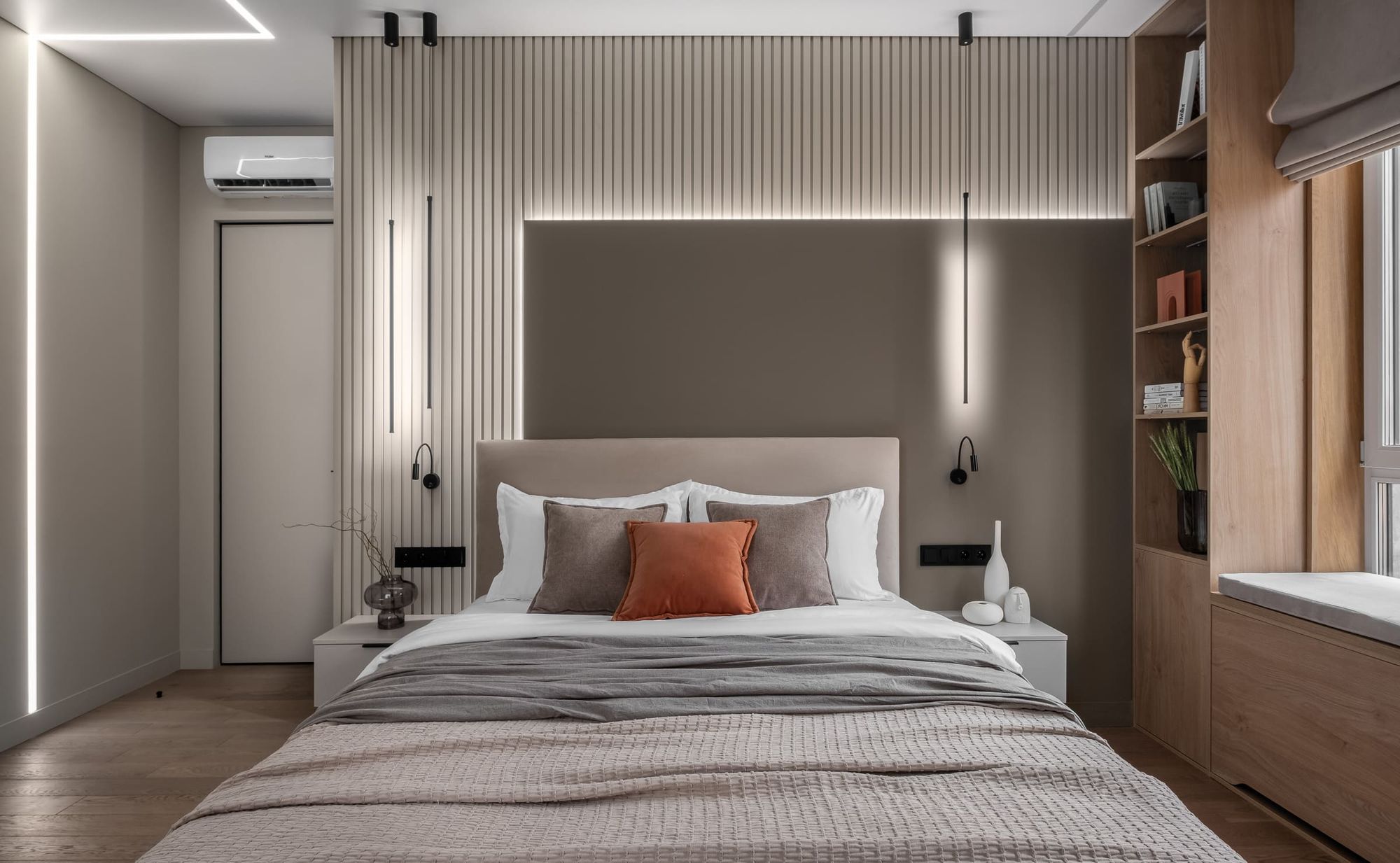Интерьер спальни продолжает не только общую цветовую, но и световую концепцию. Геометрия пространства вновь очерчена световой линией, спускающейся с потолка на стену. Геометричность прослеживается и в других элементах пространства: стена у изголовья кровати отделана рейками, рельеф которых подчеркнут подсветкой.