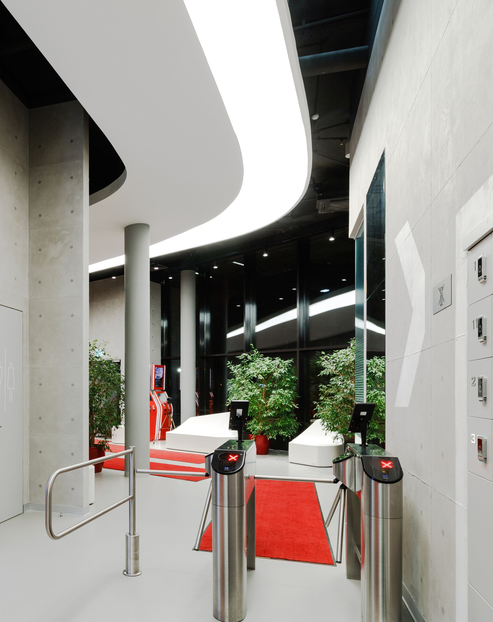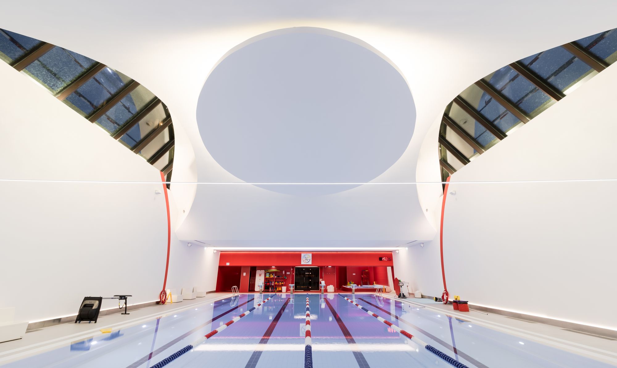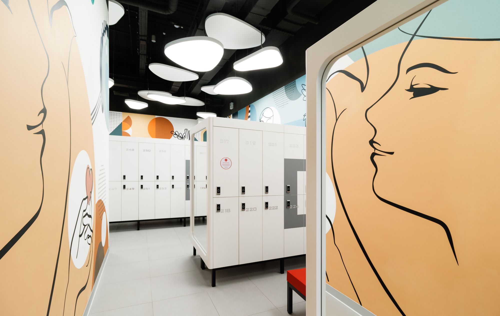 Световой дизайн построен на контрасте белого и красного, широких световых полос и тонких линий света. Линейные светильники с полупрозрачными экранами идеальны для основного освещения. Декоративная подсветка зеркал и других элементов интерьера выполнена светодиодными лентами дневного белого свечения. Границы потолка и стен в фитнес-зонах эффектно подчеркнуты линиями света.