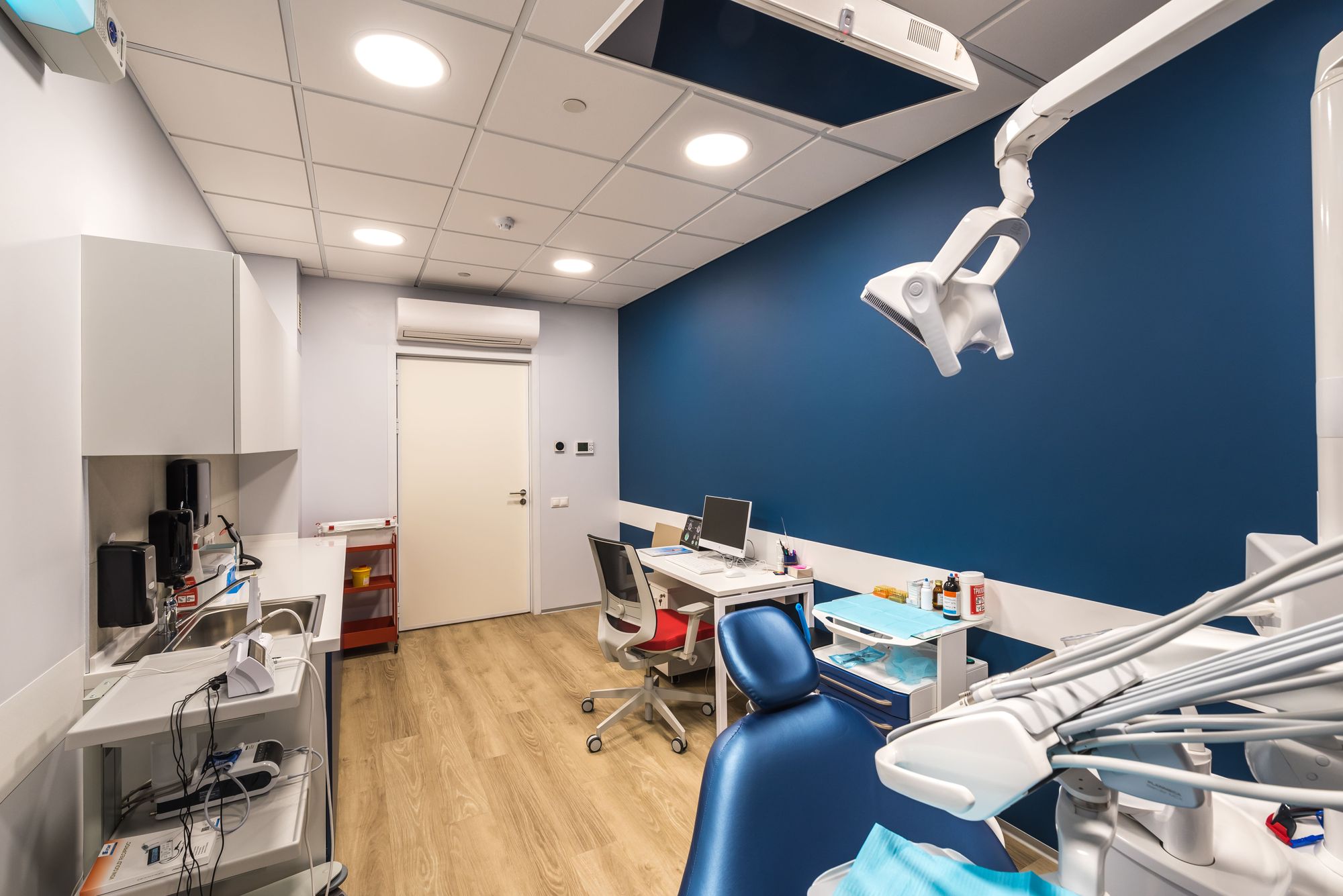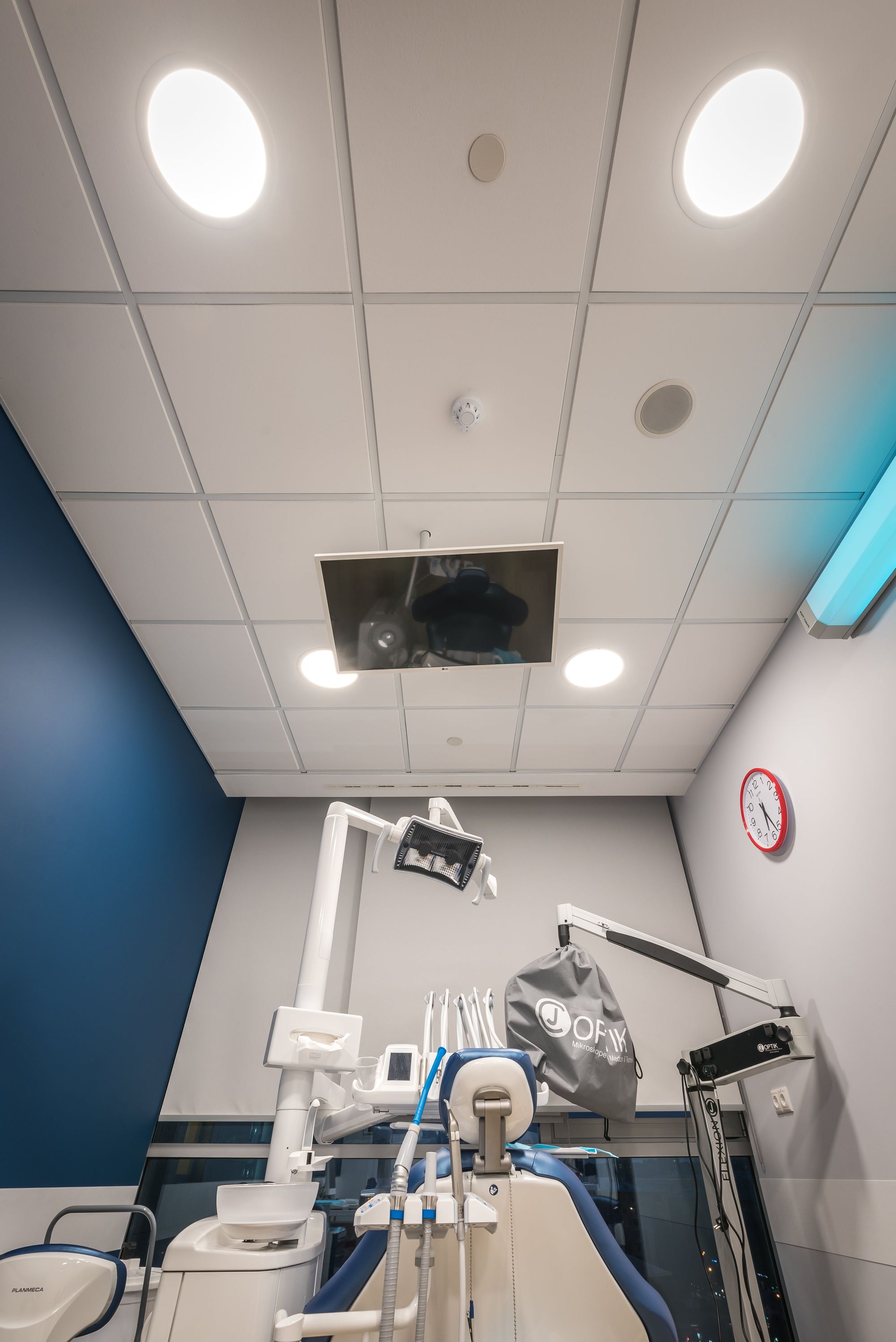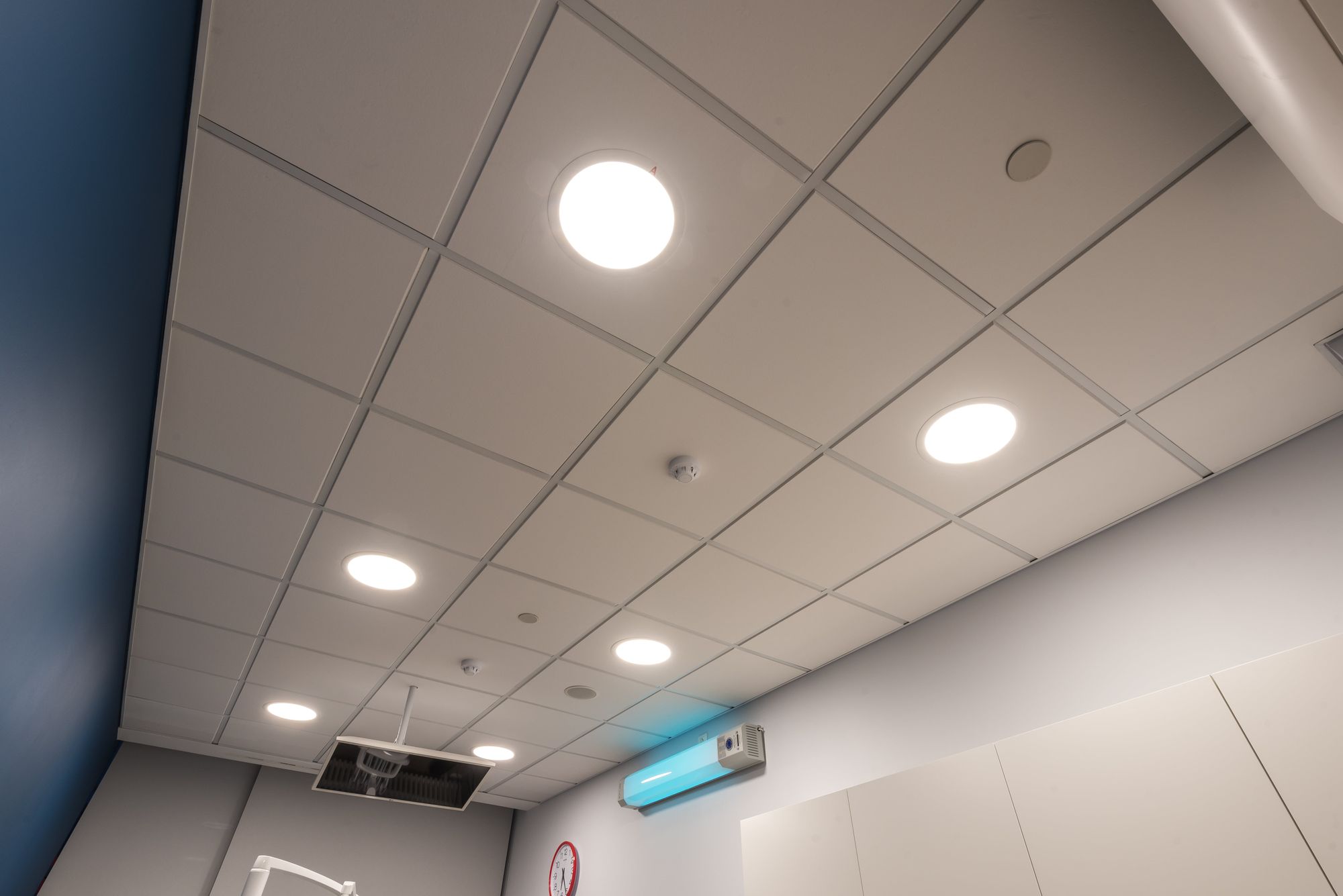Изящные и тонкие светильники серии DL могут встраиваться в натяжные и гипсокартонные потолки небольшой толщины. В данном проекте светильники выполняют роль основного освещения в медицинских кабинетах, обеспечивают прекрасный рассеянный свет, комфортный для глаз. Блоки аварийного питания позволяют светильникам работать в дежурном режиме при внезапном отключении освещения.