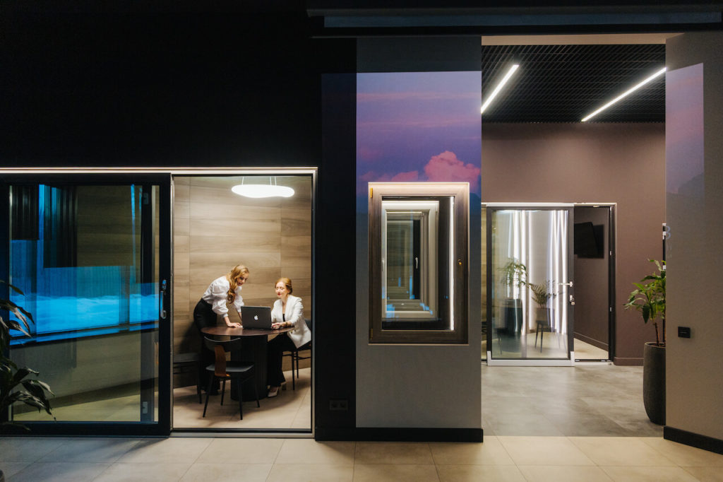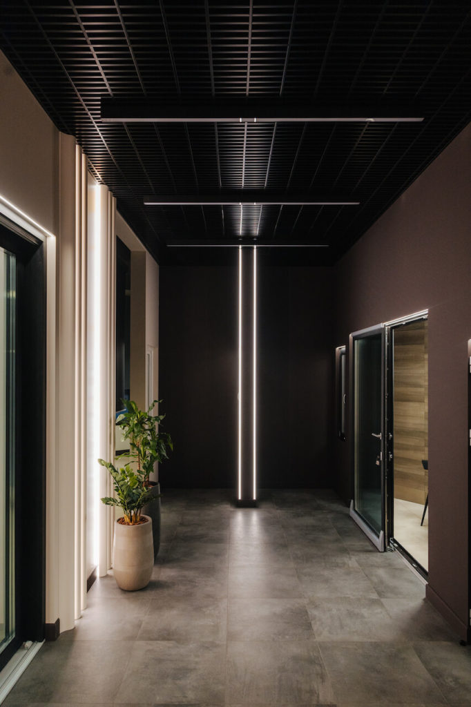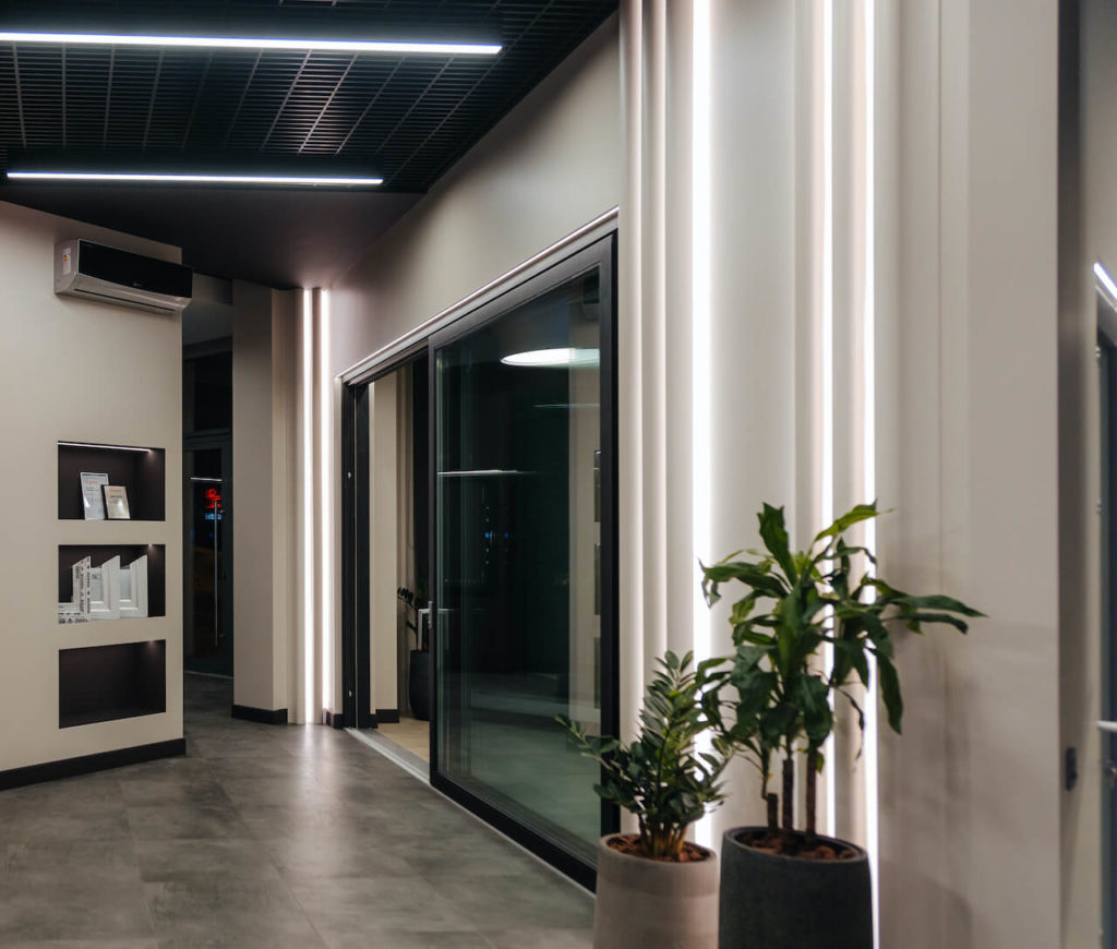 Благодаря применению качественных матовых экранов линии света не слепят и не создают резких бликов, что особенно актуально для пространства с большим количеством стеклянных поверхностей.