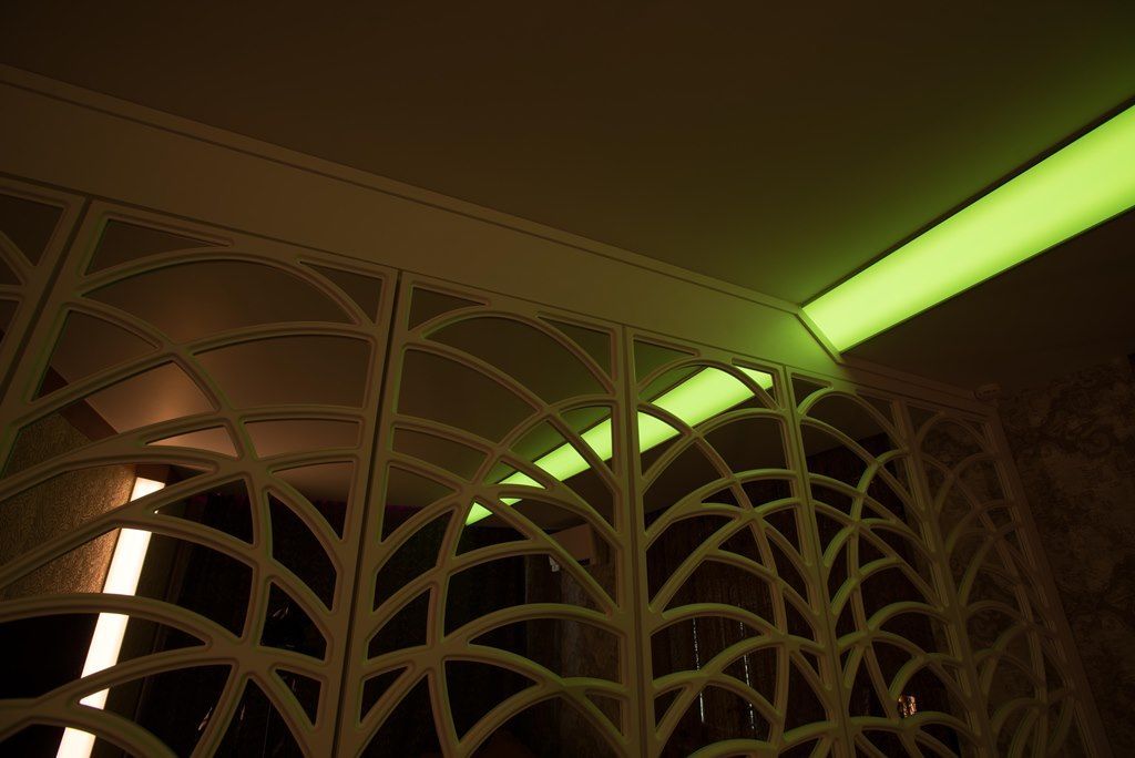 Кроме того вся подсветка в проекте выполнена с помощью многоцветной светодиодной ленты arlight®. Что значительно расширяет декоративные возможности освещения такого рода. Управление освещением происходит с помощью специального пульта с круговой панелью, вращение которой помогает легко и просто выбрать один и тысяч оттенков RGB-ленты.