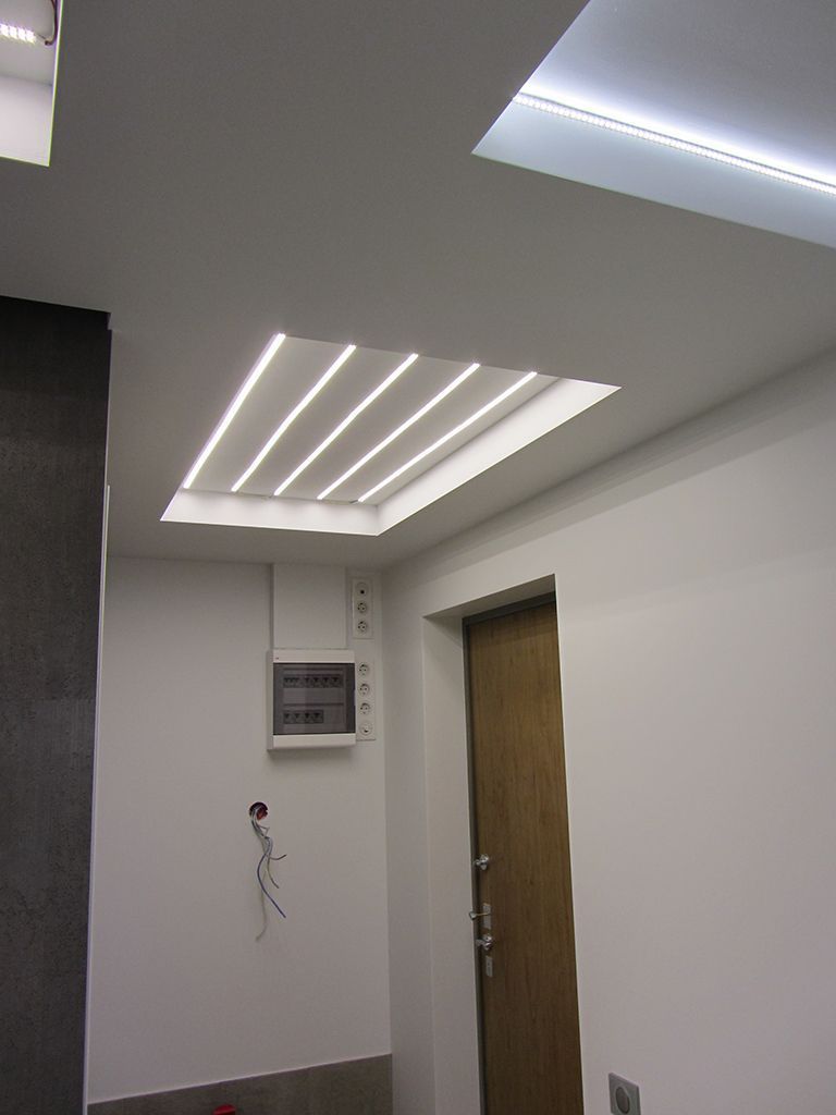 В прихожей и коридоре применено сразу две технологии монтажа потолков - гипсокартон и натяжной потолок. При помощи гипсокартона уровень потолка был опущен, появились ниши для декоративной подсветки и прямоугольные секции - углубления для организации основного освещения. В эти углубления, как и в ванной комнате, была установлена мощная двухрядная светодиодная лента Arlight дневного белого свечения. После установки светодиодных лент будет смонтирован натяжной потолок, который будет находиться вровень с гипсокартонным потолком. Таким образом получится единая поверхность потолка с прямоугольными светящимися участками.